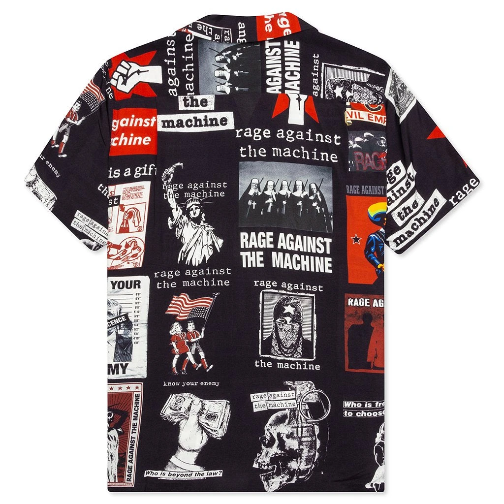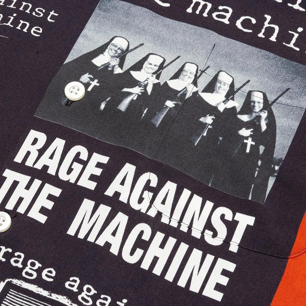 WACKO MARIA was founded in 2005 built on inspiration from American culture consisting of music, film and art. WACKO MARIA’s signature style can be described as high-end streetwear with inspiration pulled from punk, surplus and religious imagery. Pictured is the Wacko Maria Rage Against The Machine S/S Hawaiian Shirt in Black.